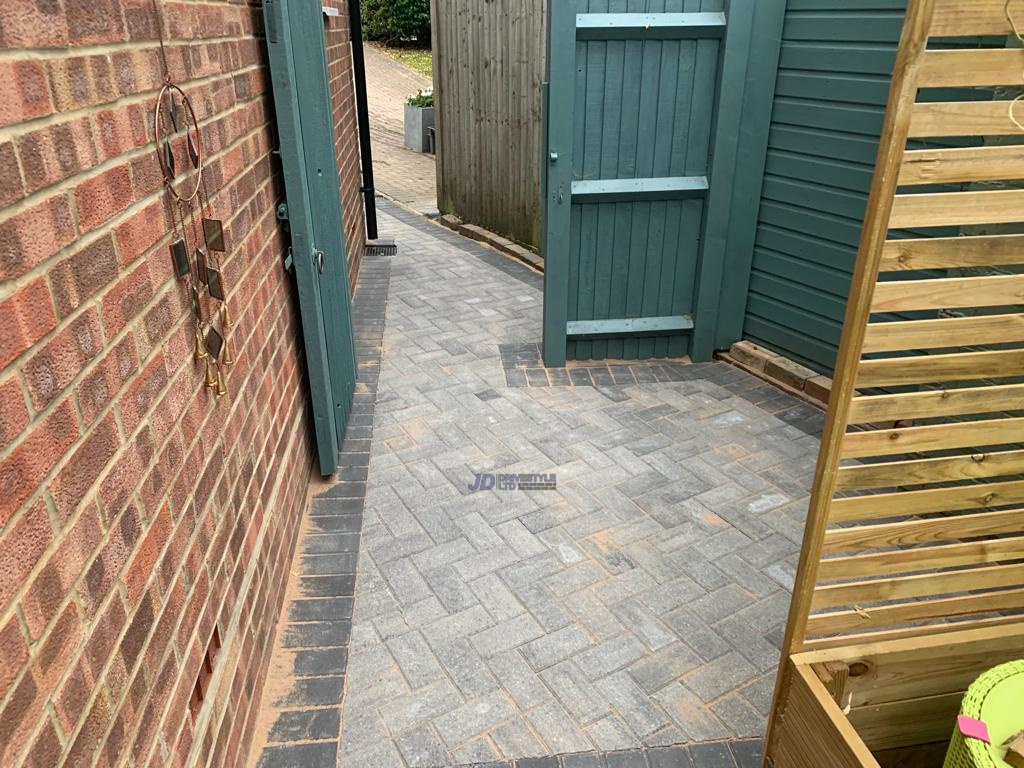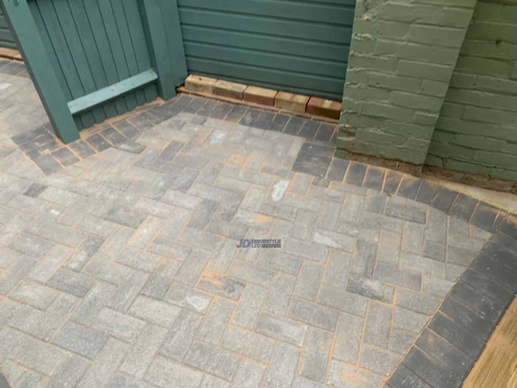 Supplied and installed a sand / grit base for laying paving, Installed paving on top of the sand, Laid the paving in a °90 degree herringbone pattern, The paving used was block paving, All open edges of paving set in concrete, Machine vibrated and compacted the paving