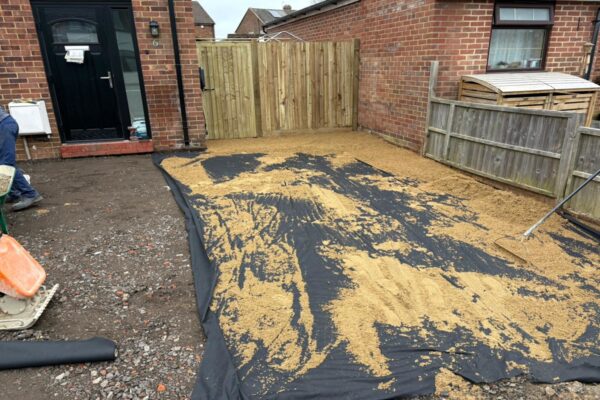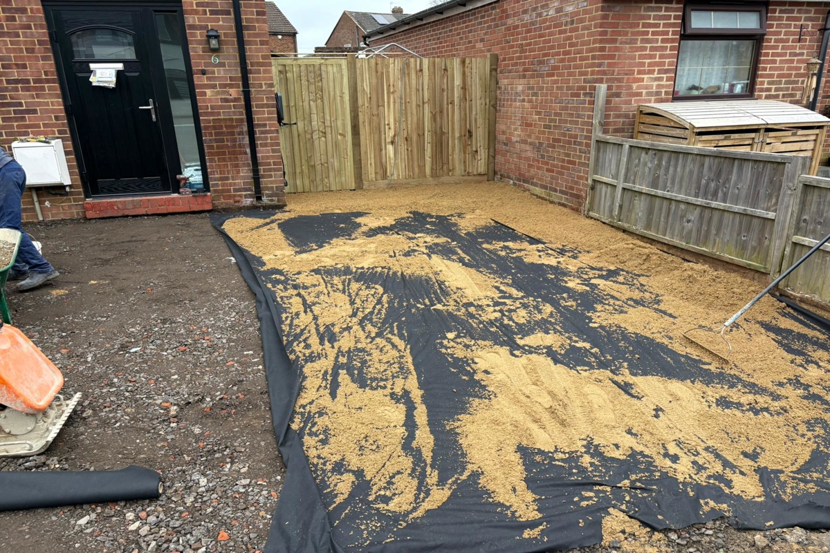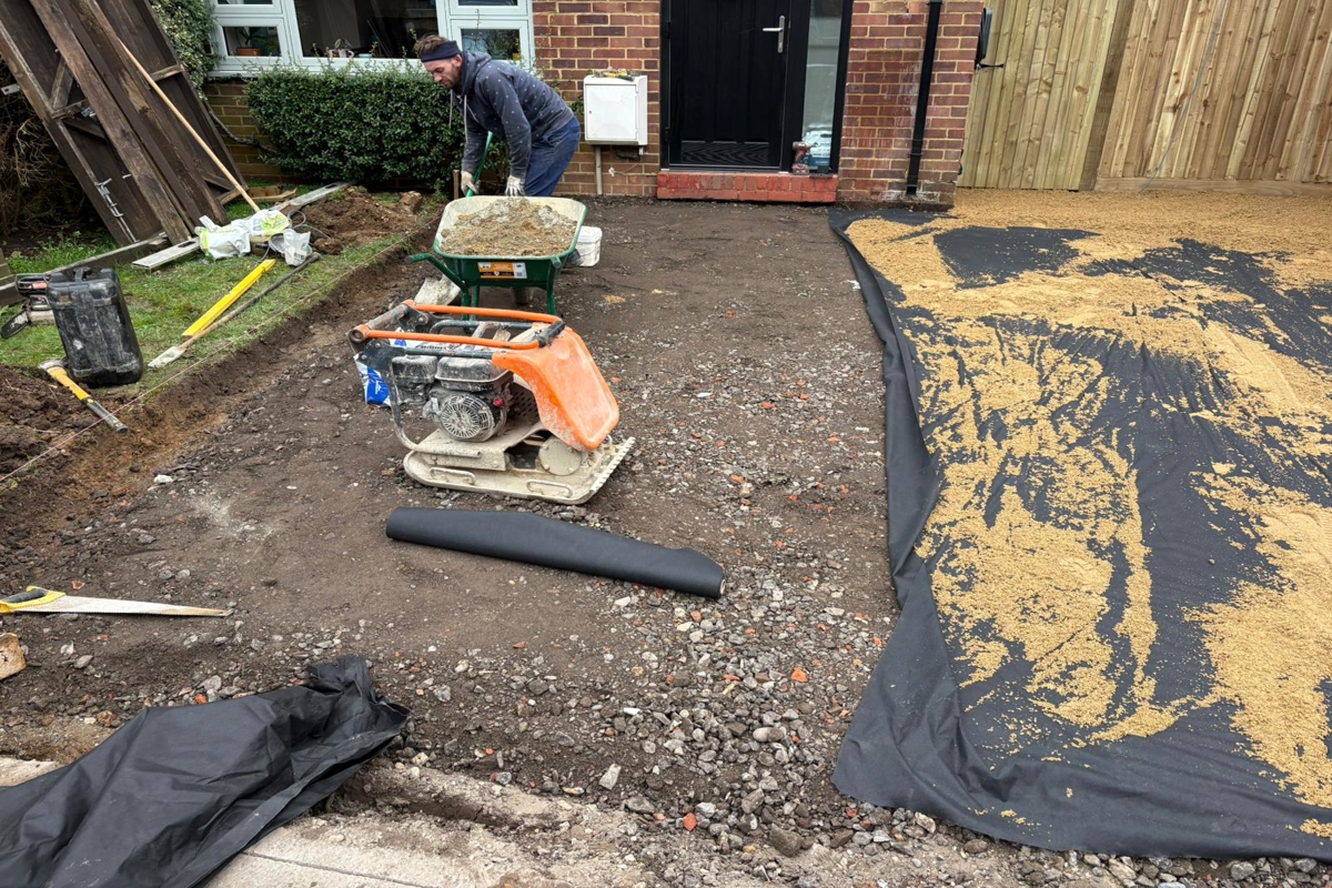 Dug out and removed the area, Redesigned the layout of the area, Adjusted the overall levels of the area, Supplied and installed MOT Type 1 foundation, Supplied and installed membrane sheetingPaving Installation