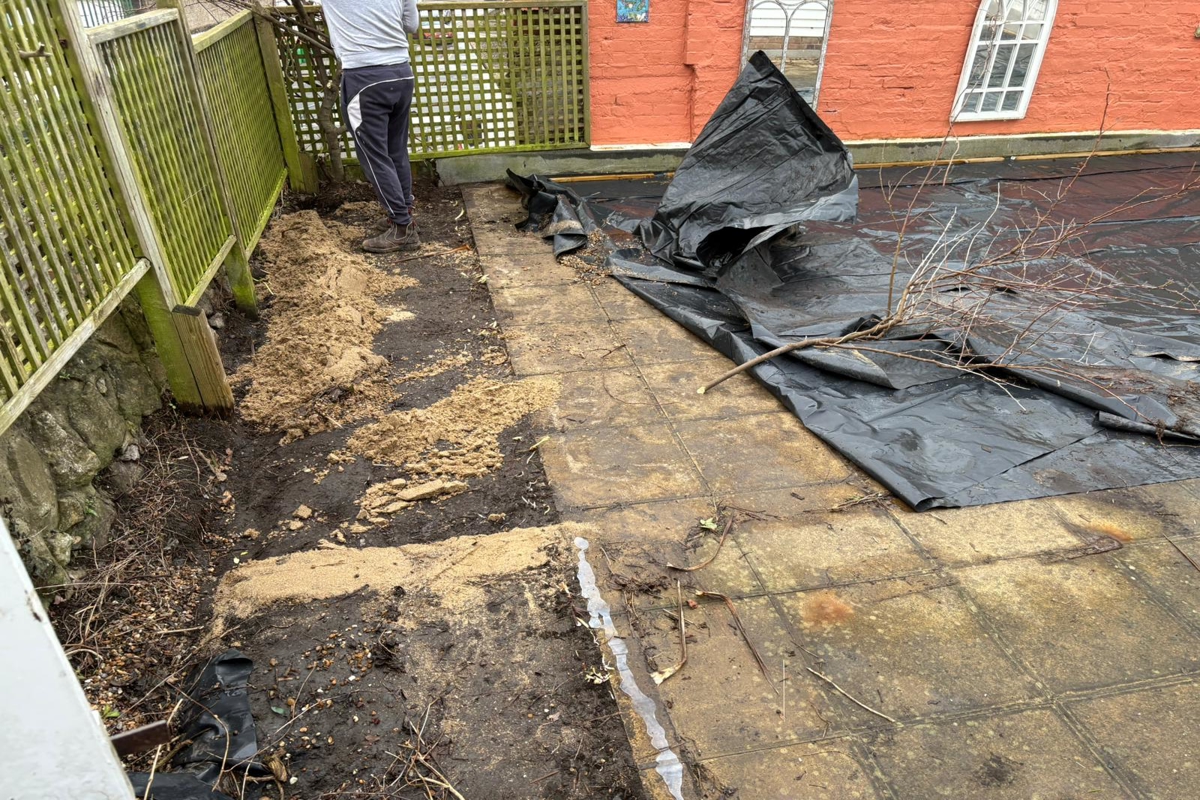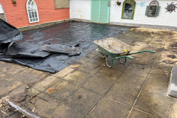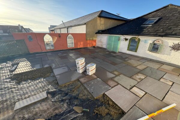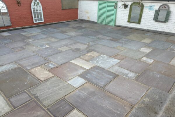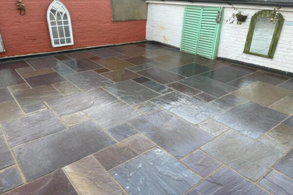 Laid down a mortar bed, Laid down Indian sandstone slabbing, Resin grouted the slabbing