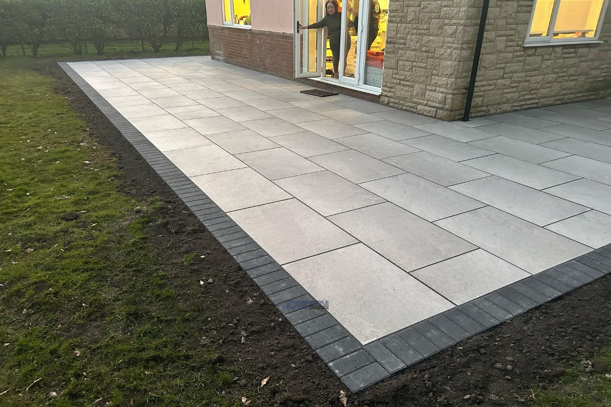 Installed a block paving border set in concrete, Laid down a mortar bed, Laid down porcelain tiles, Resin grouted the slabbing